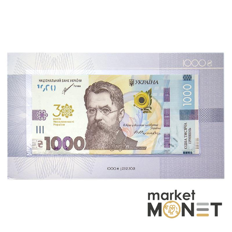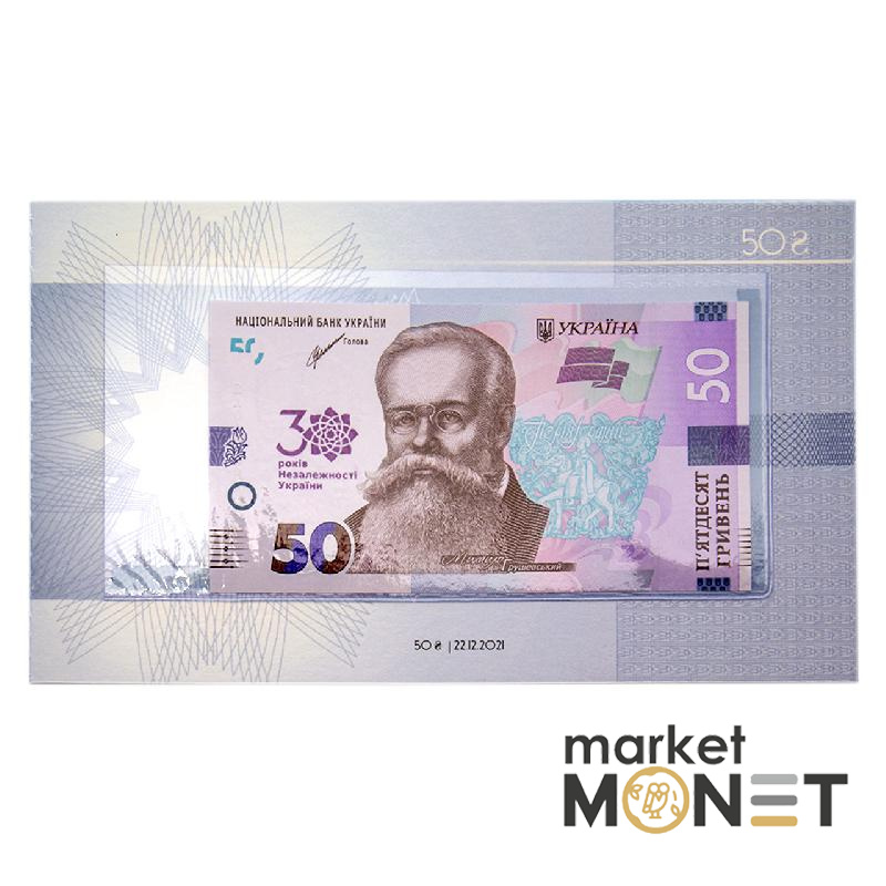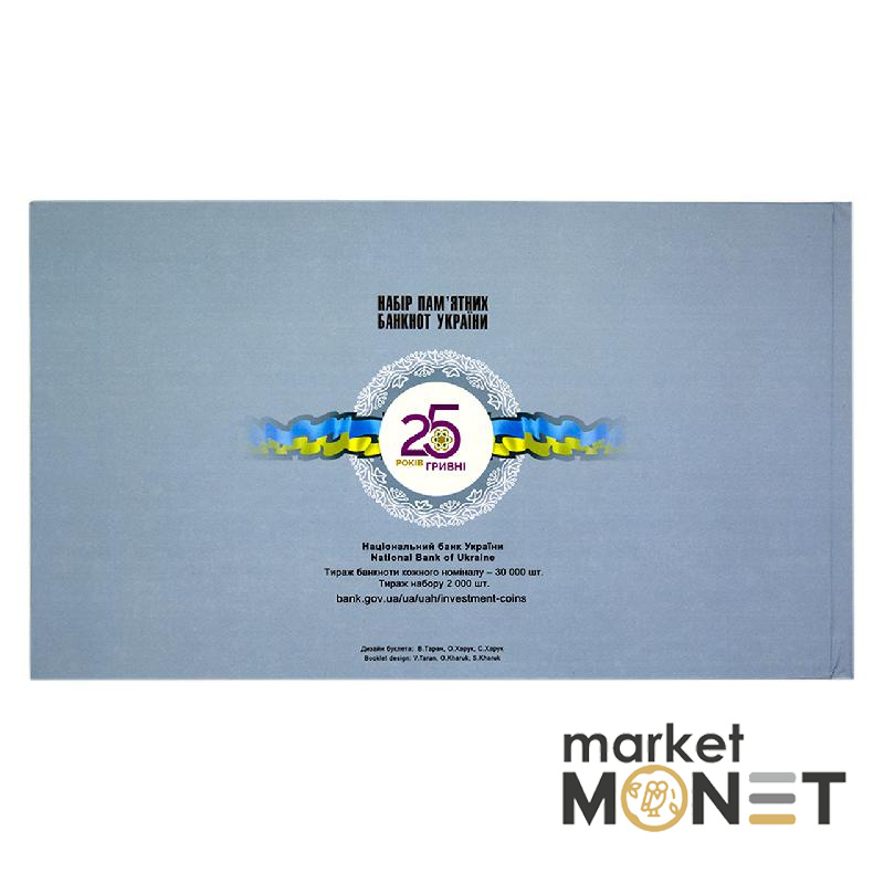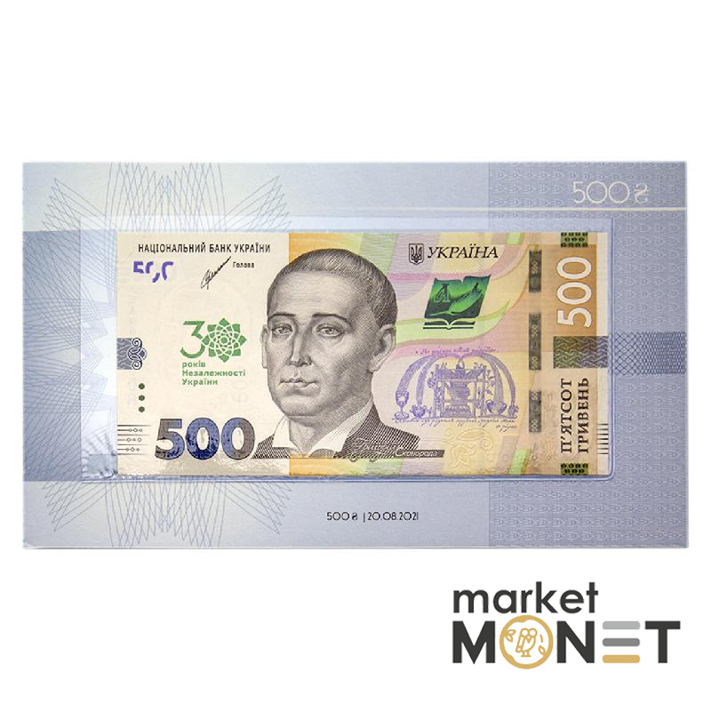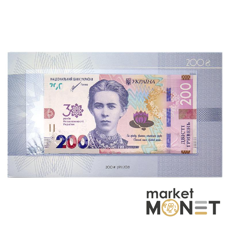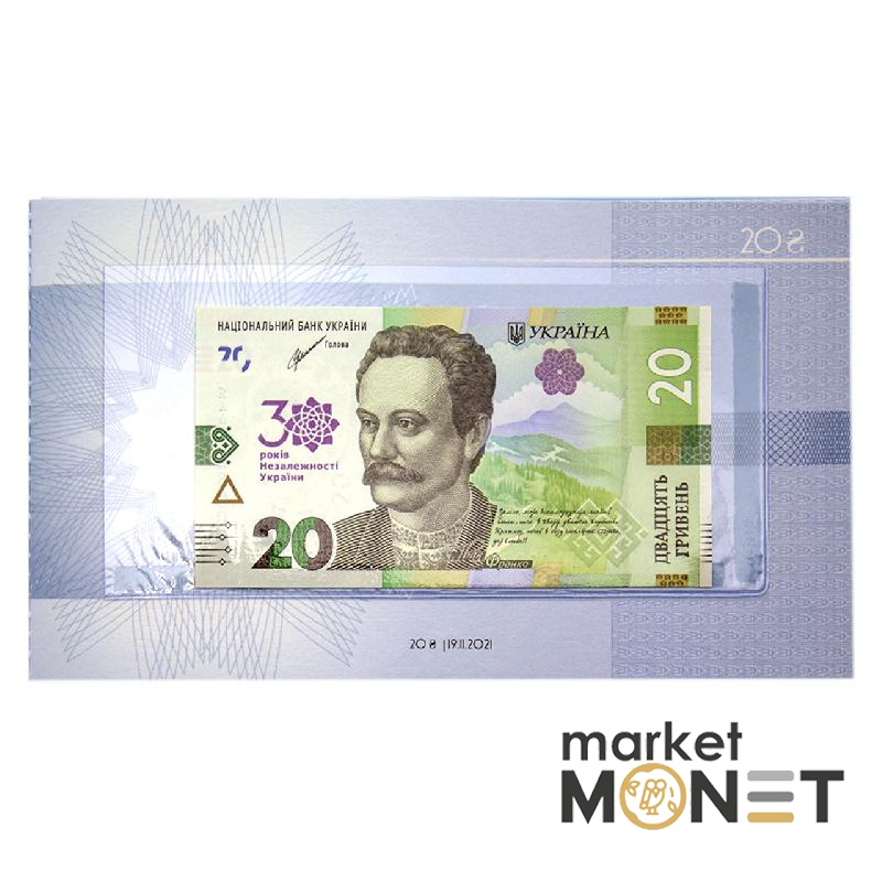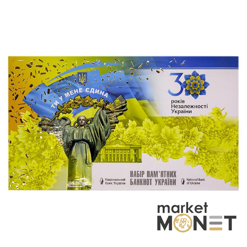 Набір колекційних банкнот усіх номіналів присвячений 30-річчю незалежності України. Набір колекційних банкнот у клясері містить шість пам’ятних банкнот усіх номіналів (20, 50, 100, 200, 500, 1 000 грн) з підписом Голови Національного банку України Кирила Шевченка серії ЯА 2021 року випуску.