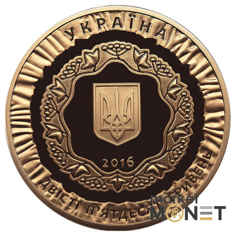 На аверсі монети розміщено: на матовому тлі напис півколом УКРАЇНА (угорі), номінал ДВІСТІ П`ЯТДЕСЯТ ГРИВЕНЬ (унизу); у центрі, на дзеркальному тлі, у колі зі стилізованого рослинного орнаменту - малий Державний Герб України, під яким - рік карбування монети 2016.