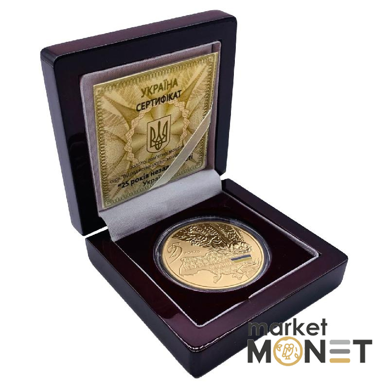 На реверсі монети зображено: на тлі стилізованого букета мапу України з жовто-блакитним прапором (елемент оздоблення - емаль) та написи 25 РОКІВ (над картою), НЕЗАЛЕЖНОСТІ УКРАЇНИ (на карті).