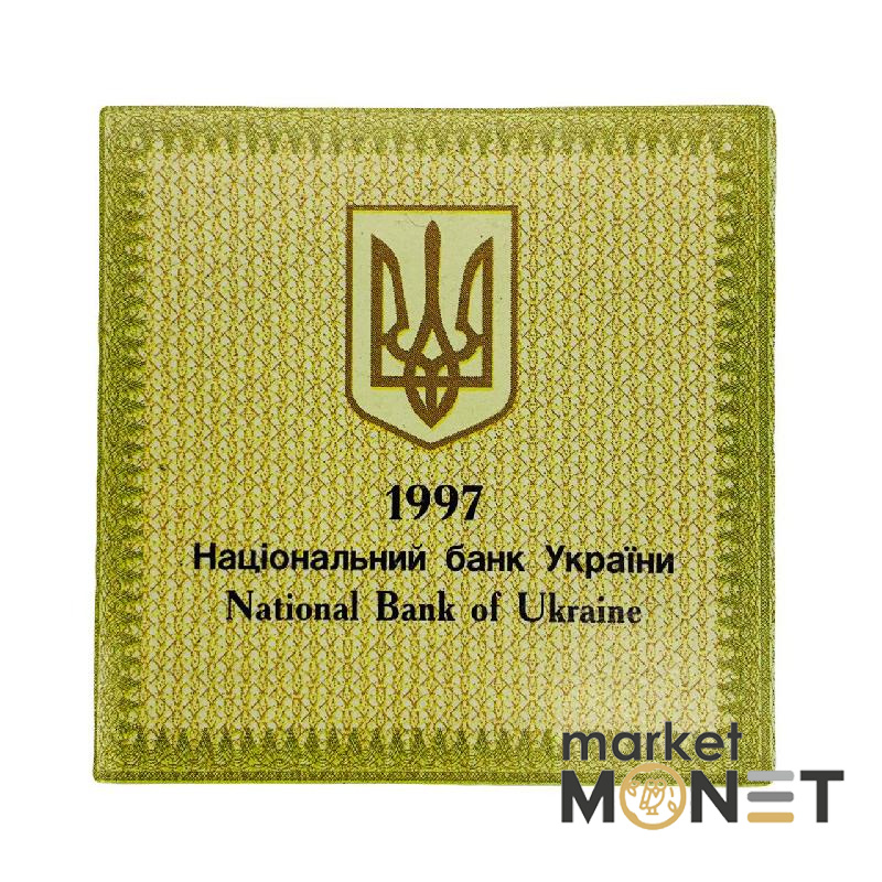 На аверсі монети зображено малий Державний герб України над старовинним фоліантом. По колу розміщено стилізовані написи: вгорі УКРАЇНА, внизу у два рядки 100 ГРИВЕНЬ. Зліва від номіналу дата 1997 - рік карбування монети, справа у два рядки розміщені позначення і проба дорогоцінного металу Аu 900 та його вага у чистоті 15,55. Вся композиція обрамлена по колу геометричним мотивом.