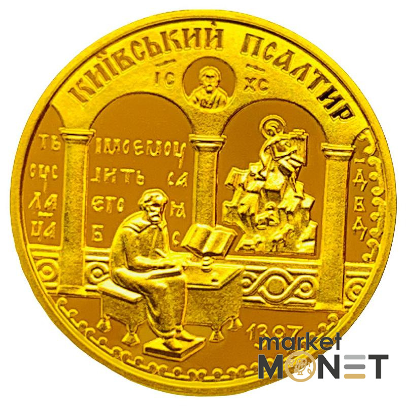 На реверсі монети на тлі аркади розміщені зображення: Христос Пантократор у колі і титли ІС-ХС (угорі) та композиції мініатюр рукопису: біблійний цар Давид (справа) і фрагмент його псалмів (зліва); Спиридоній-писар (у центрі). Угорі по колу розміщено стилізований напис КИЇВСЬКИЙ ПСАЛТИР, унизу дата 1397 - рік його написання.