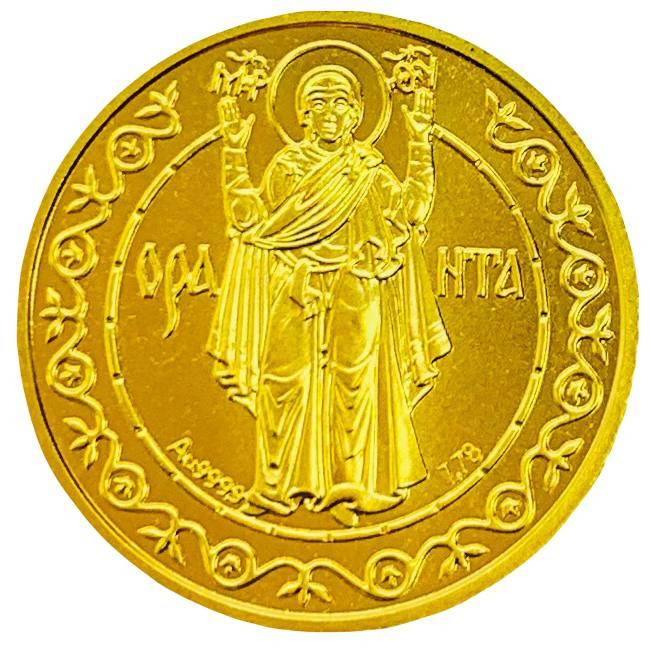 На реверсі монети в центрі кола, утвореного рослинним орнаментом, зображено фігуру Богоматері Оранти - головної мозаїки центральної апсиди храму. Фігура Богоматері поділяє навпіл горизонтально розташований напис ОРАНТА. Внизу над рослинним орнаментом розташовані позначення і проба дорогоцінного металу та його вага у чистоті.