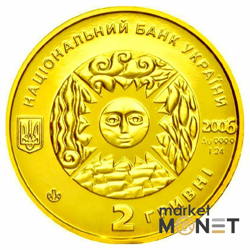 На аверсі монети розміщено коло, діагонально розділене на сектори, що символізують чотири стихії – землю, повітря, воду, вогонь; у центрі кола – стилізоване зображення сонця. Зліва від кола – малий Державний Герб України, праворуч – рік карбування монети 2006, позначення металу, його проби – Au 999,9, маса – 1,24; по колу монети – написи: НАЦІОНАЛЬНИЙ БАНК УКРАЇНИ (зверху), 2 ГРИВНИ (знизу), а також – логотип Монетного двору Національного банку України.