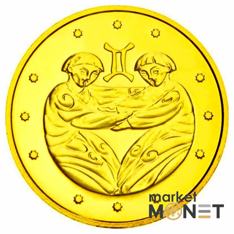 На реверсі монети розміщено стилізоване зображення Близнюків в оточенні зірок, над якими символ знака зодіаку.