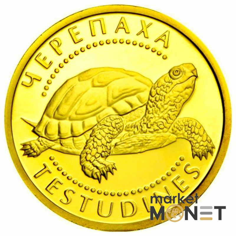 Пам'ятна монета «Черепаха» – золота пам'ятна монета Національного банку України, присвячена черепасі – символу довголіття та мудрості. Черепахи (лат. Testudines) – один із чотирьох сучасних загонів плазунів. Містить близько 328 сучасних видів, що групуються в 14 сімейств і два підзагони. Викопні залишки черепах простежуються протягом понад 220 мільйонів років. Відмінною ознакою черепах є панцир, що складається з двох частин: карапаксу та пластрону, і службовець основним захистом від ворогів. Черепахи поширені у тропічній та помірній кліматичних зонах майже по всій Землі. Екологічно їх поділяють на морських та наземних, а наземних, у свою чергу, на сухопутних та прісноводних. Монету було введено в обіг 29 квітня 2009 року. Належить до серії «Найменша золота монета». Гравер: Володимир Дем'яненко