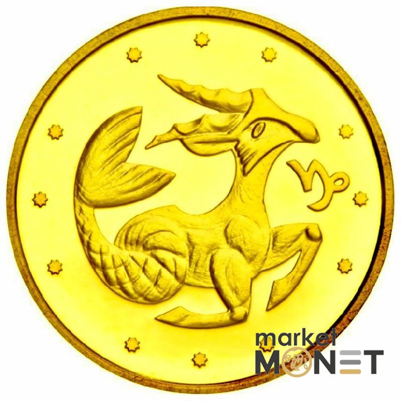 На реверсі монети розміщено стилізоване зображення Козерога в оточенні зірок, праворуч від якого символ знака зодіаку.