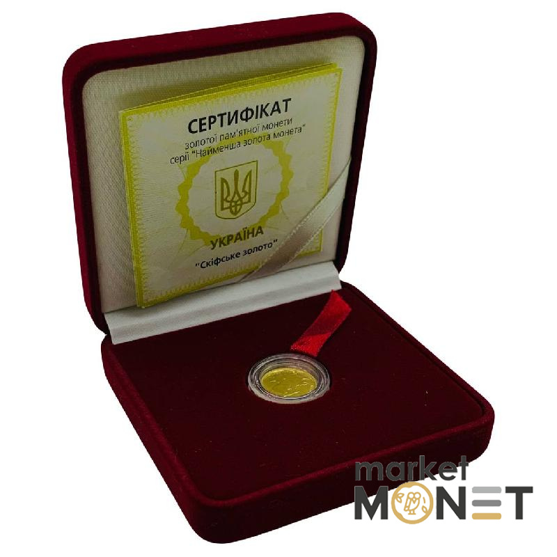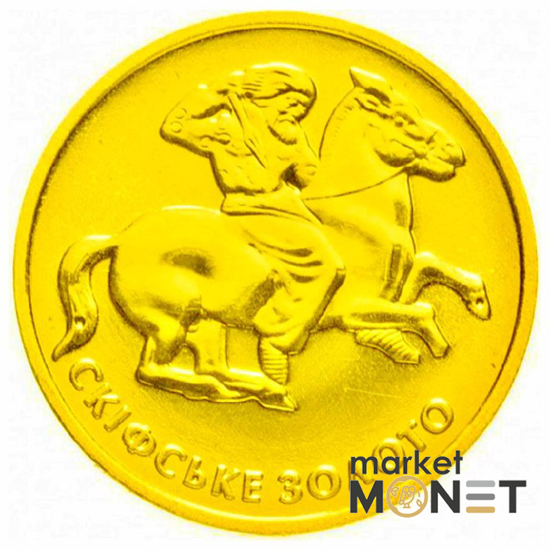 На реверсі монети зображено золоту бляшку у вигляді рельєфної профільної фігури скіфського вершника, знайдену в 1830 році під час археологічних розкопок кургану Куль-Оба поблизу міста Керч.
