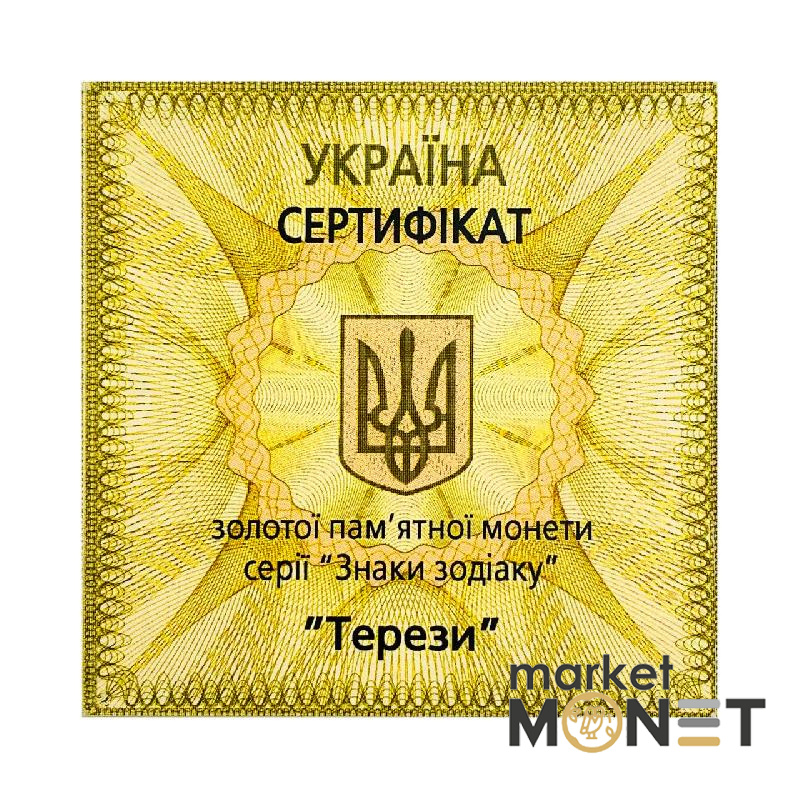 Золота монета «Терези» – це пам'ятна подарункова золота монета знака зодіаку, випущена Національним Банком України у рамках серії монет «Знаки Зодіаку». Монета присвячена сузір'ю «Терези». До кожної золотої монети додається сертифікат НБУ з описом усіх характеристик монети.