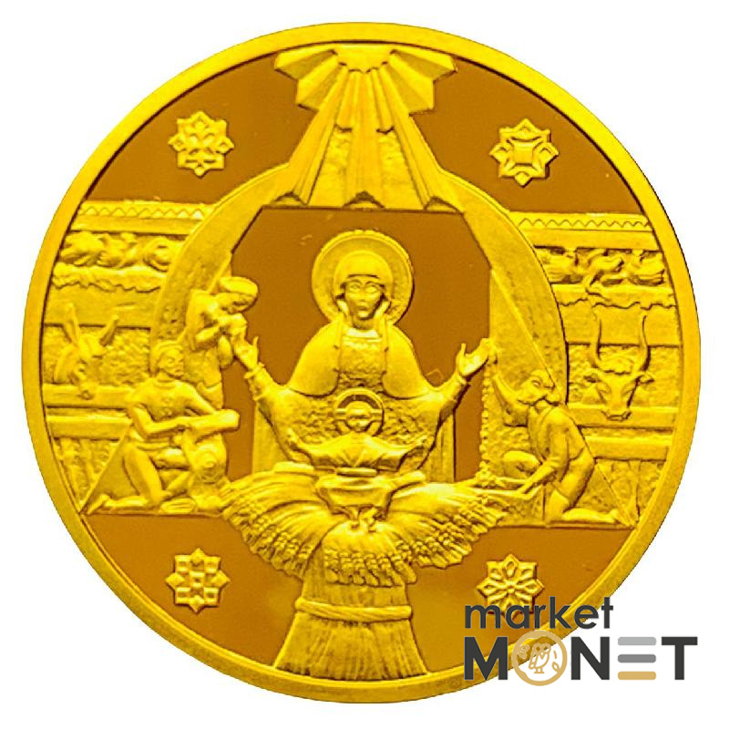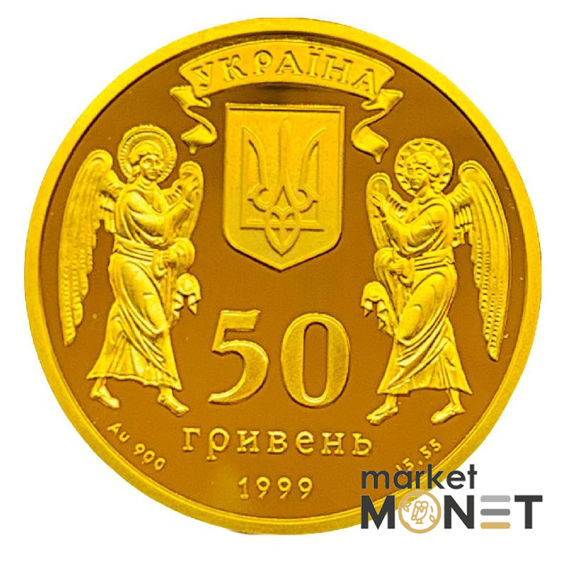 На аверсі монети між двома постатями ангелів розміщено зображення малого Державного герба України і написи: на монеті з золота - УКРАЇНА та 50, ГРИВЕНЬ, 1999, позначення металу - Au, його проба - 900, вага у чистоті - 15,55;