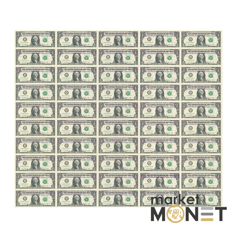 Презентационная фотография. Номер банкнот может не совпадать с номером на фото Лист банкнот 1 доллар, не разрезанный, 50 банкнот на листе.