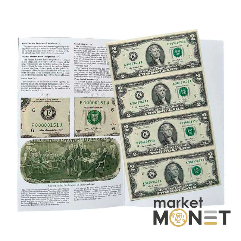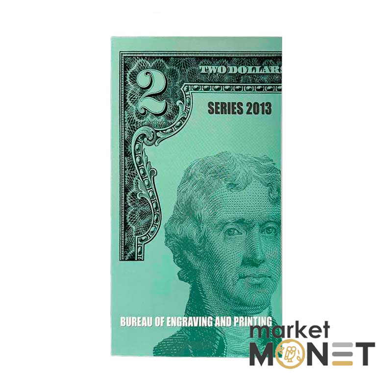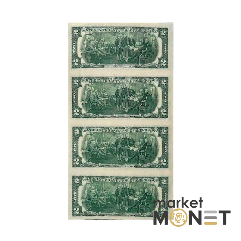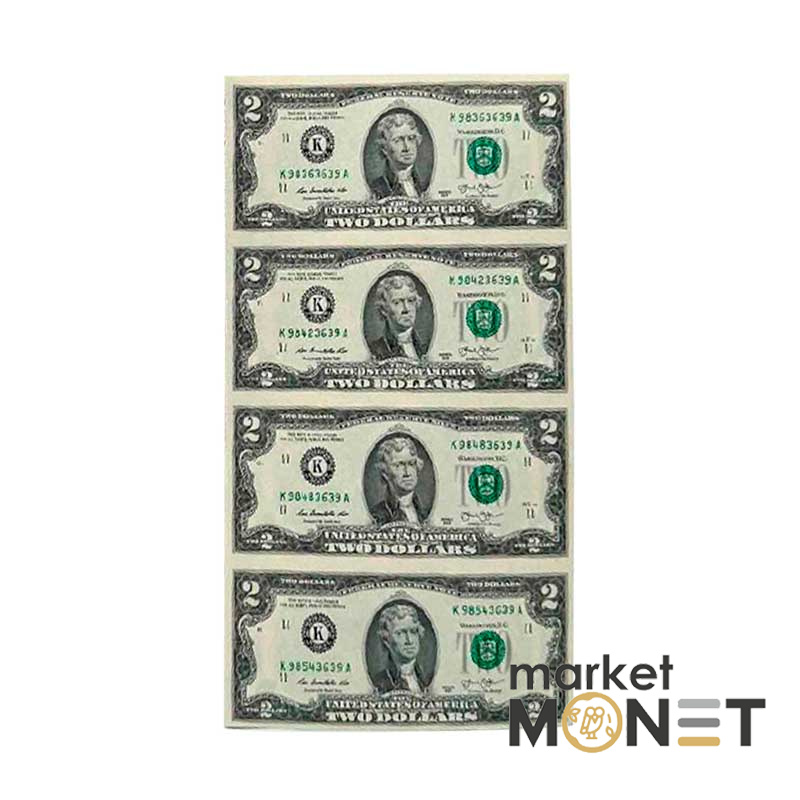 Презентационная фотография. Номер банкнот может не совпадать с номером на фото Лист банкнот 2 доллара 2013 года, не разрезанный, 4 банкнот на листе.