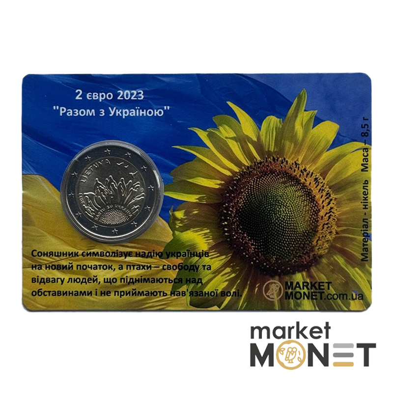 Слева полукругом выгравирован год выпуска 2023 года и страна-эмитент Литва. Завершает мотив надпись „KARTU SU UKRAINA“, расположенная на внутреннем краю подсолнечника.