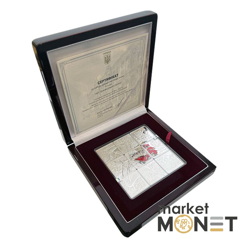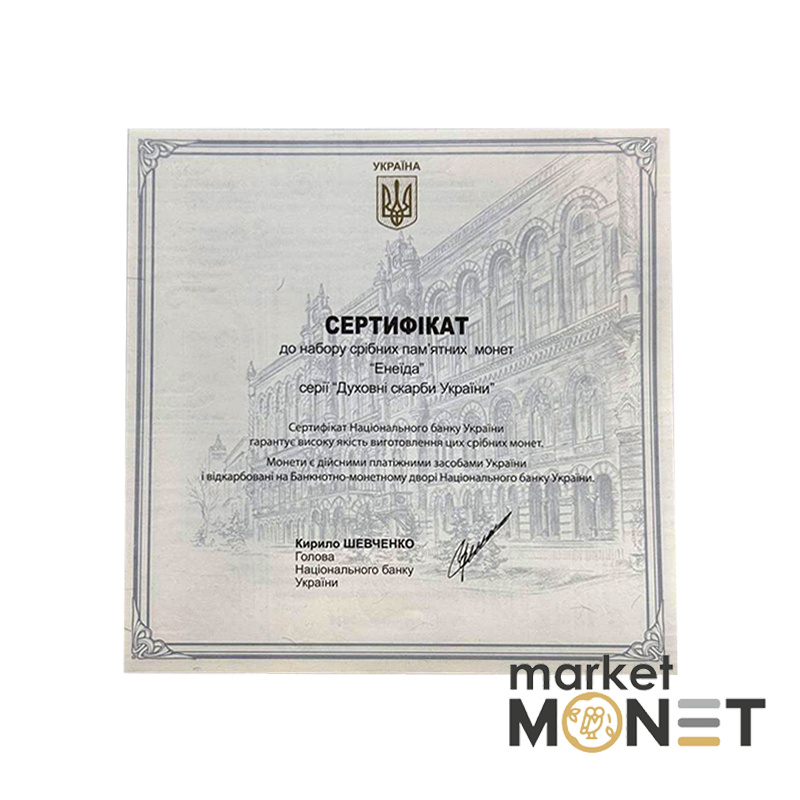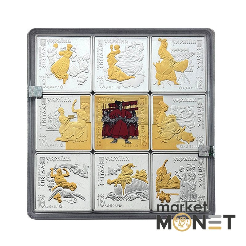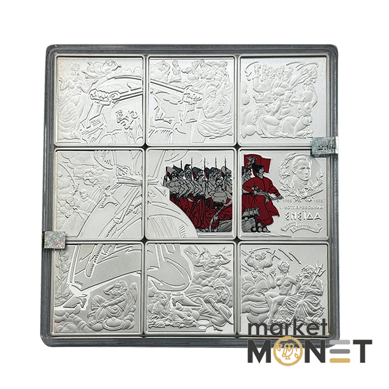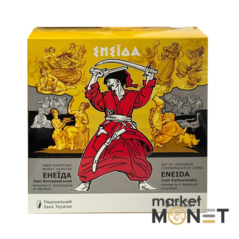 Набор из девяти памятных монет посвящен духовному и культурному памятнику украинского народа – поэме “Энеида” выдающегося украинского писателя Ивана Котляревского, который основал этим произведением новую украинскую литературу. "Энеида" написана живым народным языком, жизнь украинцев изображена в широком контексте языка, истории, обычаев, традиций и быта. Уникальная индивидуальность украинского народа гениально схвачена автором в веселых, жизнерадостных образах – казаки не признают победы над собой ни земных, ни небесных сил: ничто не может сломить их патриотического, свободолюбивого духа. За основу композиции набора использованы иллюстрации народного художника Украины Анатолия Базилевича, который своими работами придал произведению новое звучание.