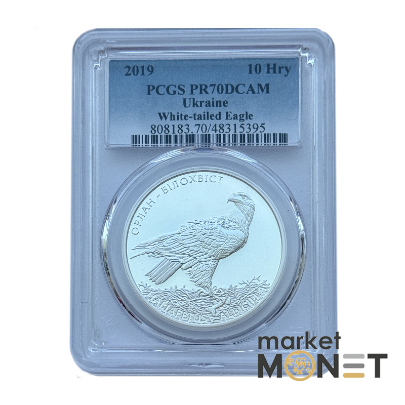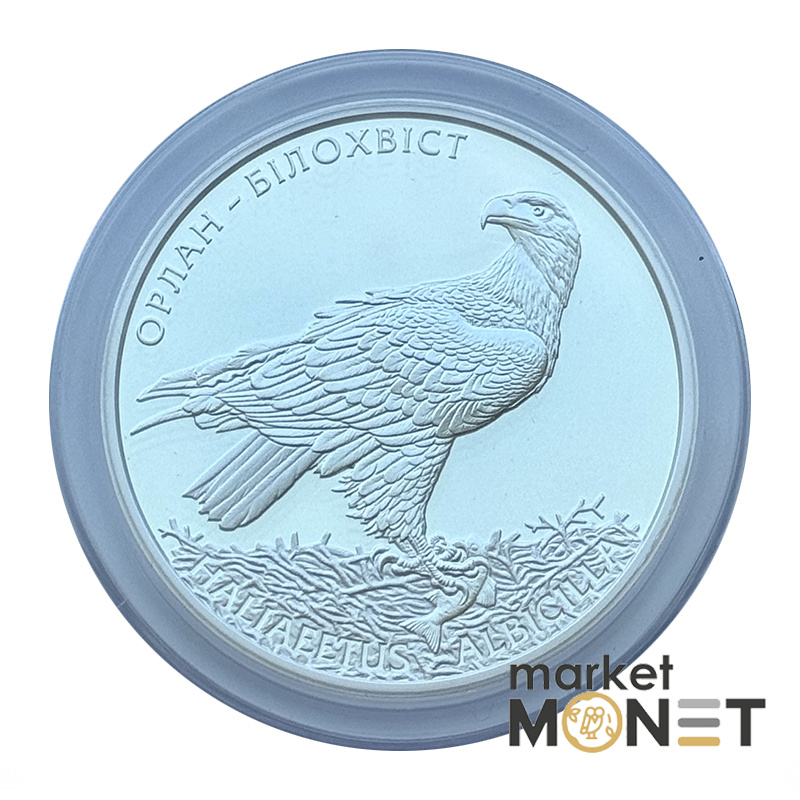 Посвящена орлану-белохвосту – одному из крупнейших представителей хищных птиц Евразии, исчезающему виду (ряд – Соколообразные, семья – Ястребовые), включенному в Красную книгу Украины и Европейский Красный список животных и растений, находящихся под угрозой исчезновения. На аверсе монеты в обрамлении венка, образованного из изображений отдельных видов флоры и фауны, размещен малый Государственный Герб Украины и надписи: УКРАИНА/10/ГРИВЕН/2019. На реверсе монеты на зеркальном фоне изображены орлана-белохвоста и надписи полукругом: ОРЛАН-Белохвост (вверху слева), HALIAEETUS ALBICILLA (внизу).