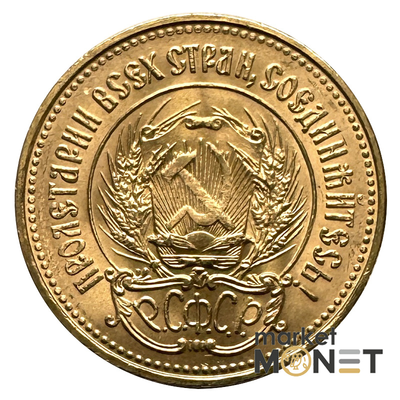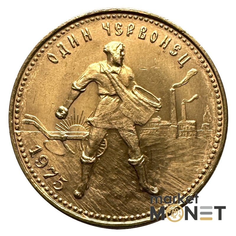 На реверсе изображен крестьянин-сеятель на фоне плуга, восходящего солнца и заводов. По кругу – надписи, обрамленные кругом из точек: вверху – "ОДИН Червонец", внизу слева – год выпуска.